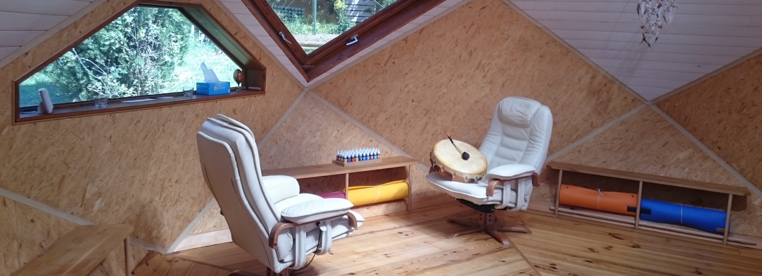 Il est important que l’endroit où sont convoquées ces énergies soit propice à leur déploiement. Voilà pourquoi j’ai personnellement choisi de travailler dans un zome qui est l’architecture idéale pour ce genre de travail grâce à ses ondes de formes douces liées à ses caractéristiques géométriques, qui en font un espace sacré. Les proportions du nombre d’or y sont inscrites, la forme spiralée est également représentée. Elle rentre en résonnance avec le standard universel de l’hélice omniprésent dans la nature, mais également la présence des losanges, d’un puits de lumière étoilé en 12 branches, de sa base hexagonale.